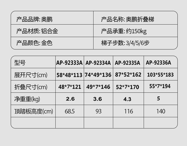 商品名称:奥鹏加厚铝合金宽踏板家用梯子五层人字梯折叠收纳登高爬扶楼梯两用室内防滑移动楼梯顶踏板特别加宽五步加厚【92335A香槟色】