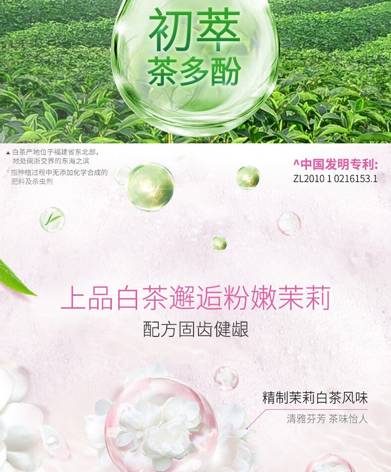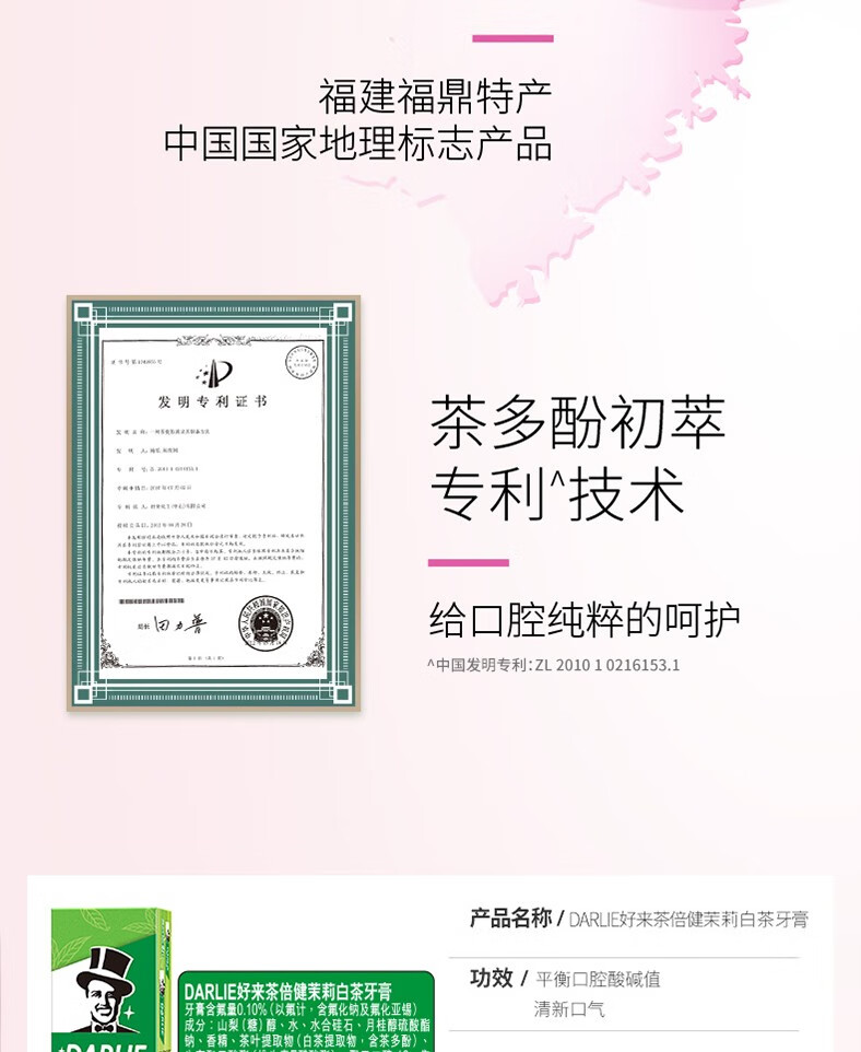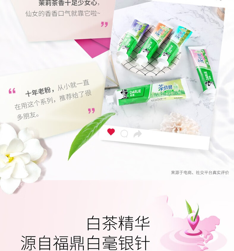 商品名称:DARLIE 好来(原黑人)牙膏清新口气茶倍健茉莉白茶护龈健齿含氟牙膏 茶倍健茉莉白茶190g