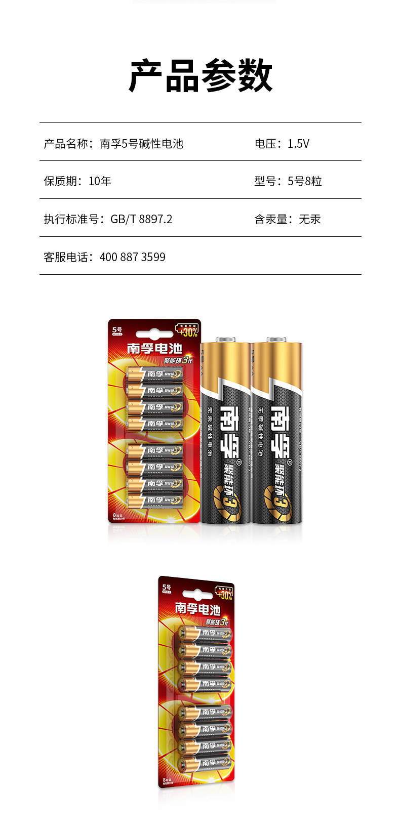 商品名称:南孚(NANFU)5号电池8粒 五号碱性 聚能环3代 适用挂钟键盘遥控器玩具血压计血糖仪等