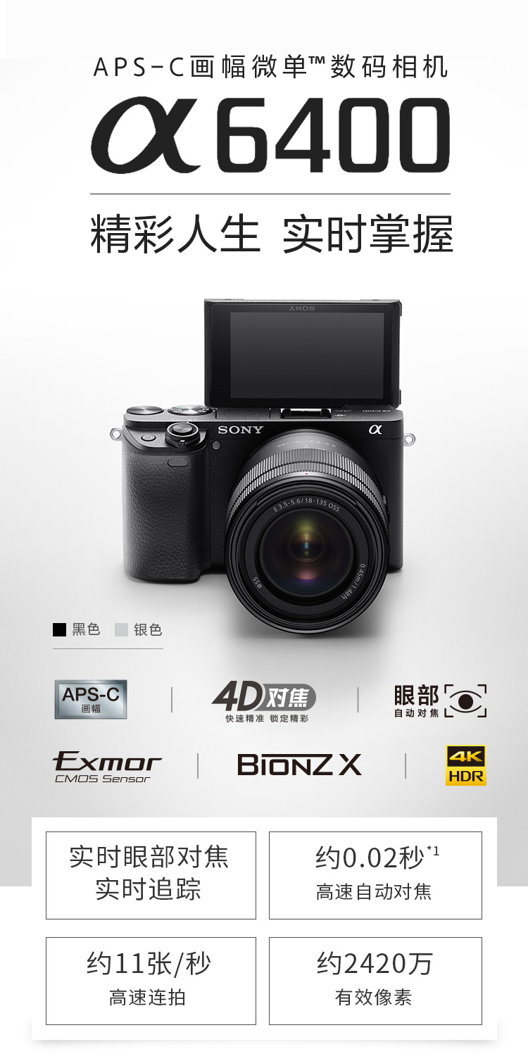 商品名称:索尼(SONY)Alpha6400M旅行便携套装(SEL18135镜头)黑色(ILCE6400M/A6400M/α6400m)官方标配