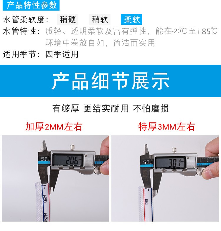商品名称:PVC水管软管家用防冻洗车塑料浇花水管浇菜蛇皮管牛筋管花园管6分加厚白管100米3mm厚度
