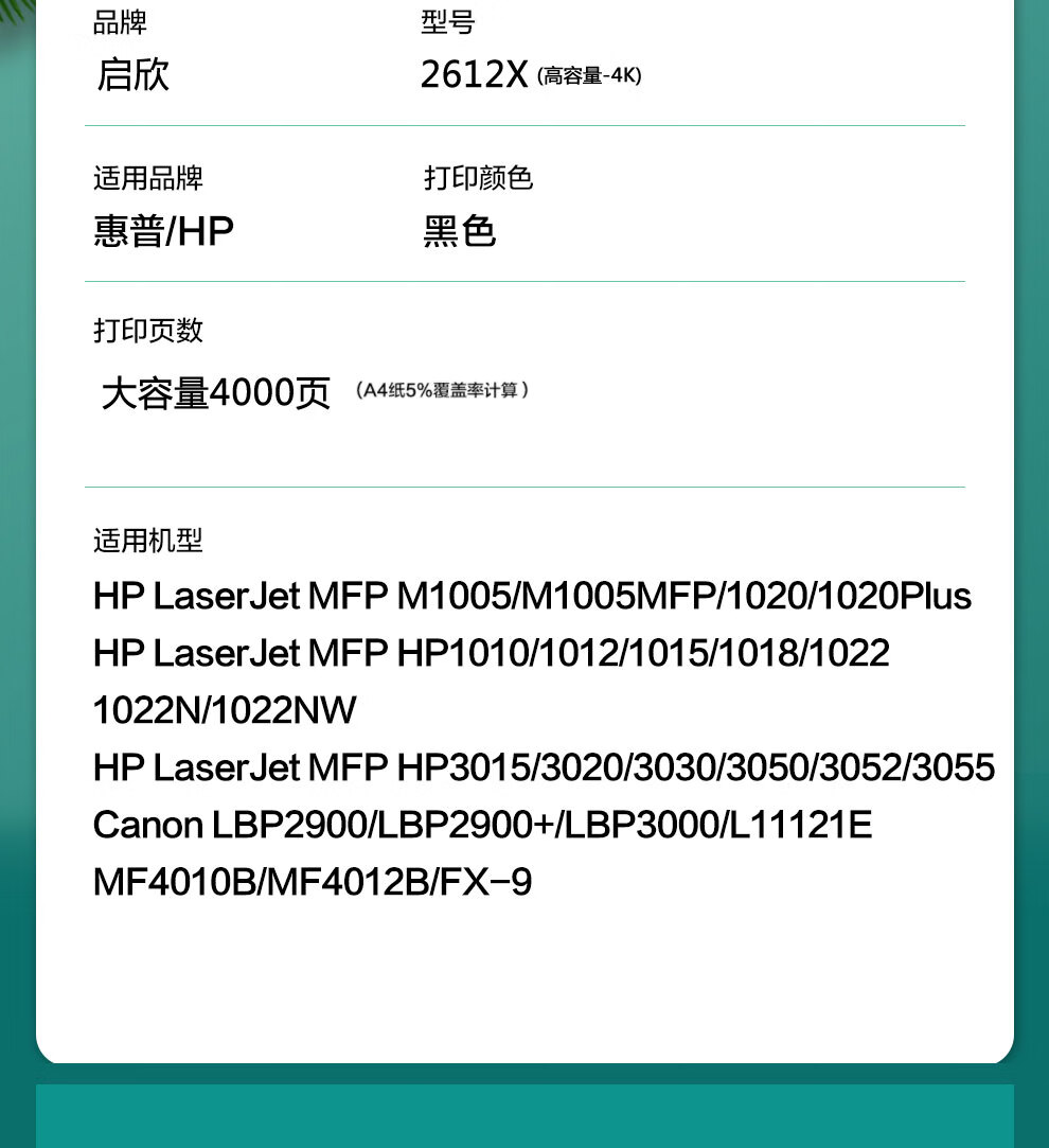 商品名称:启欣环保激光硒鼓 QX-2612X(大容量)适用惠普HP1010 1012 1022 1015 1018 黑色