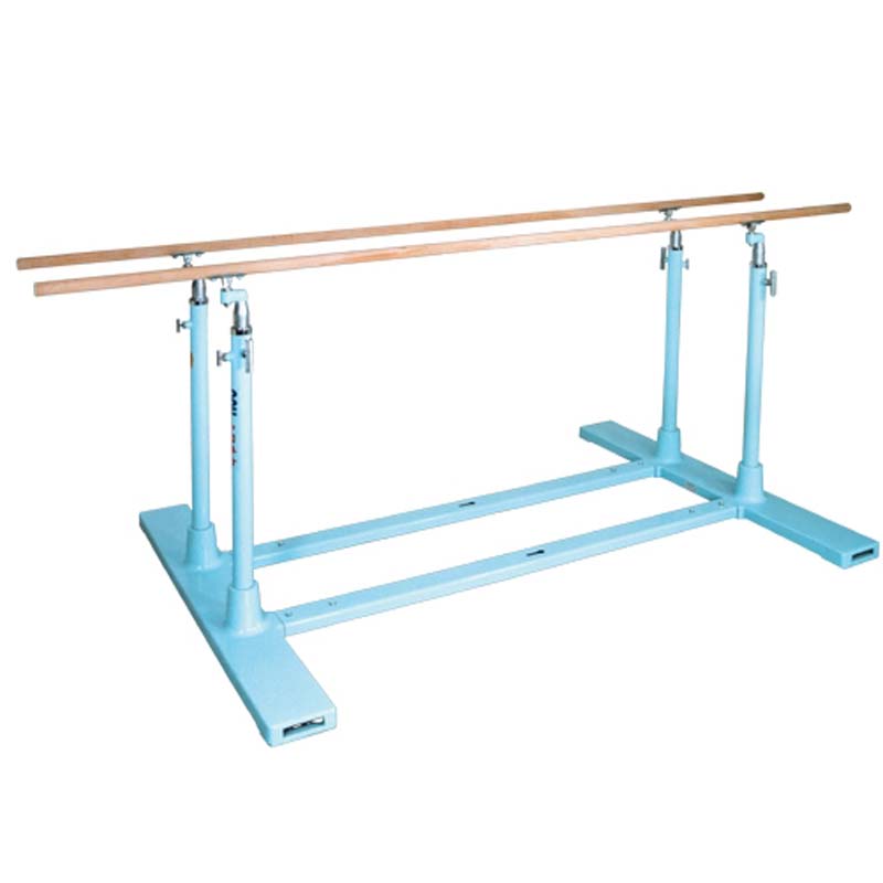 通过手轮锁紧装置可在1.5m-2.05m范围内调节高度,以满足比赛和训练的要求。鹅颈式弯头结构可在0.42m-0.52m范围内调整两杠宽度,为不同身材的使用者选择适宜的使用跨度。