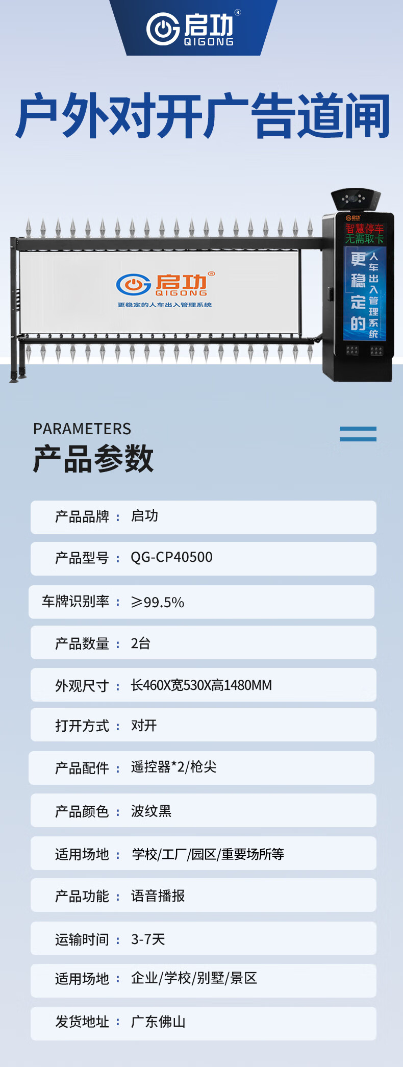 商品名称:启功车牌识别道闸智能对开广告道闸小区企业单位停车道闸QG-CP40500