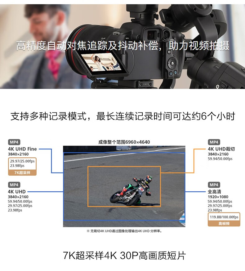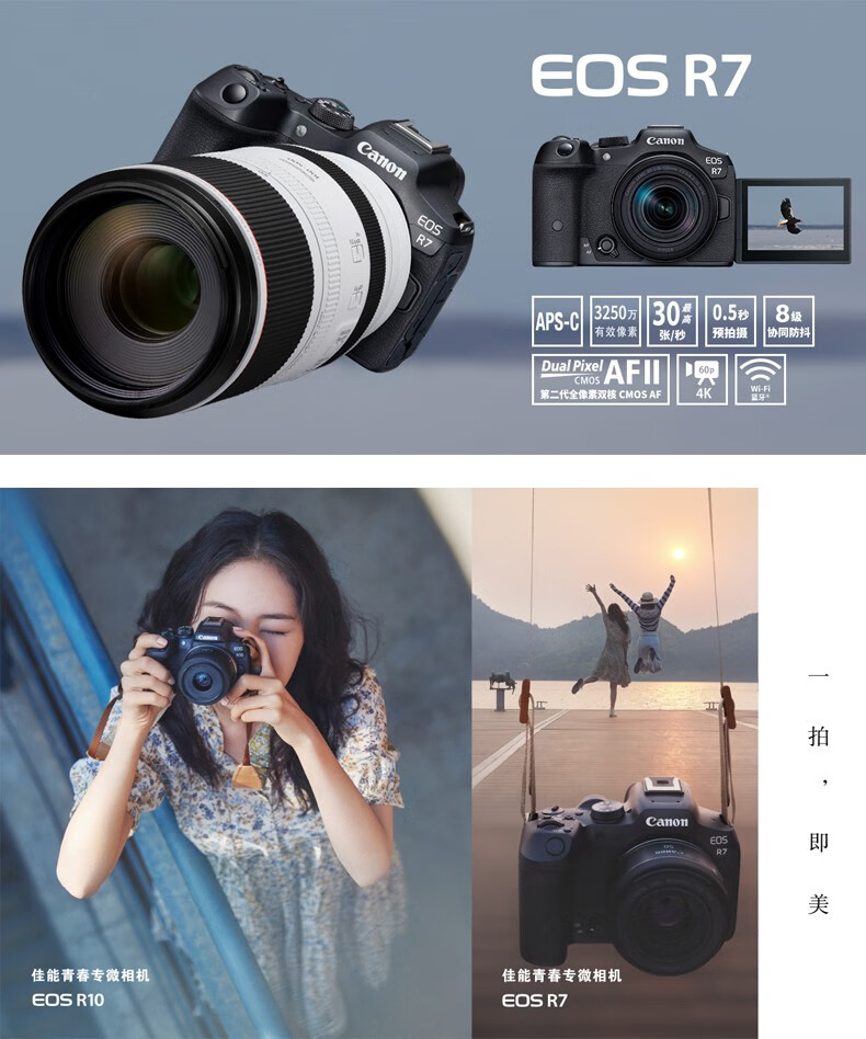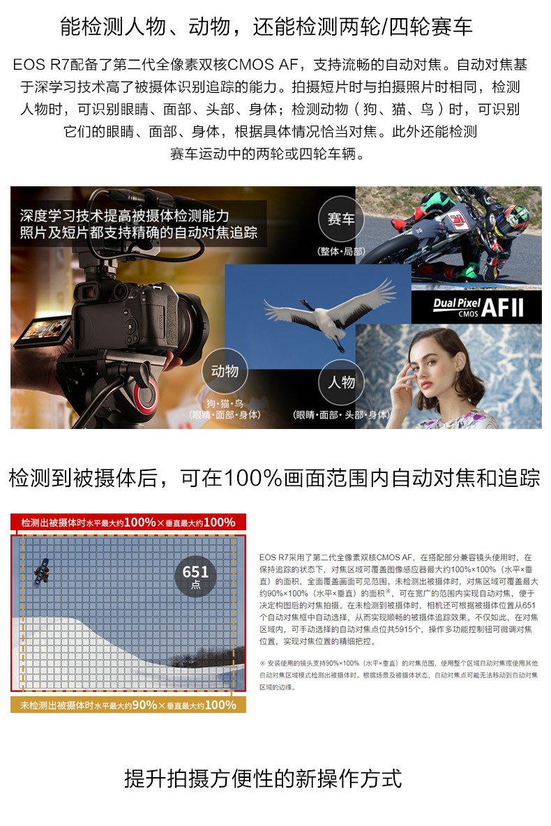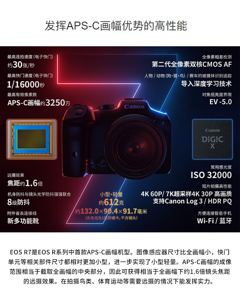 商品名称:佳能(Canon)EOSR7专业微单相机家用旅游4K高清数码照相机Vlog视频直播相机单机身/不含镜头【独立包装/未拆封】套餐三【256G卡EOS包滤镜套装三脚架等】