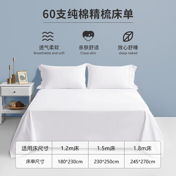 商品名称:纯白色床单单件60支100%纯棉酒店单人标间1.2米床180x230cm